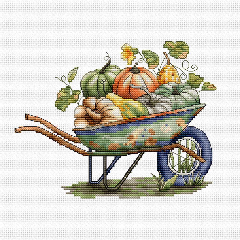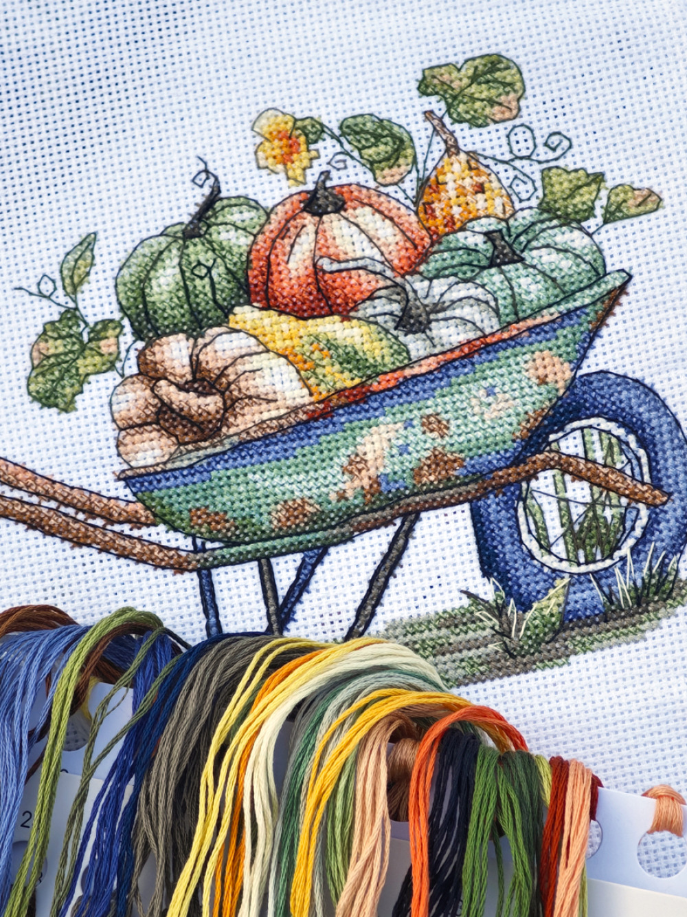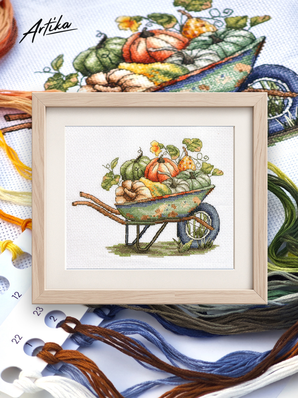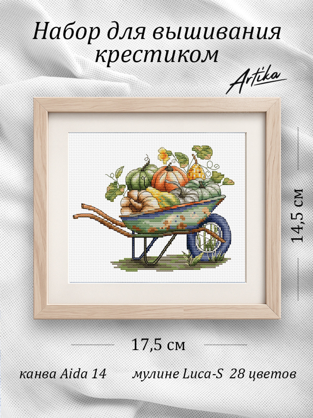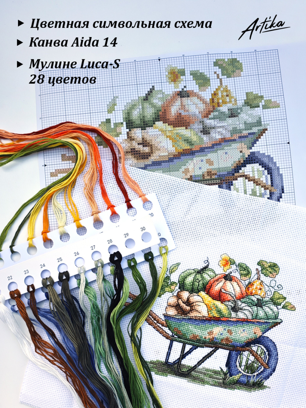 Набор для вышивания крестиком «Тележка» на канве от бренда «Артика». Размер готовой работы 18х14 см. Мулине Luca-S - 28 цветов. Канва Aida 14 белая. Также в комплекте: печатная цветная символьная схема и схема Saga, две иглы для вышивания.