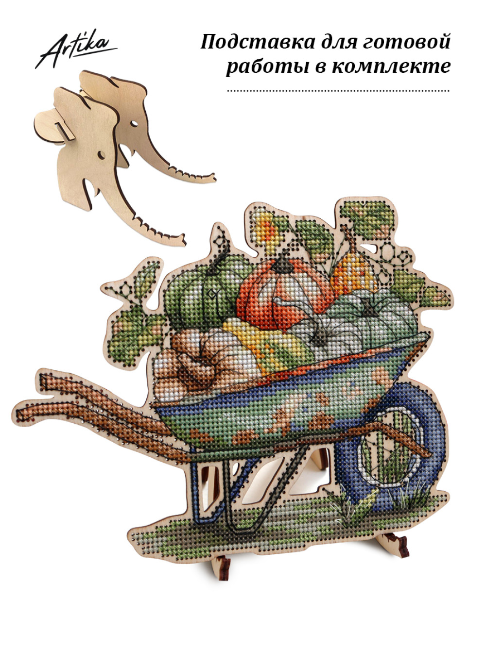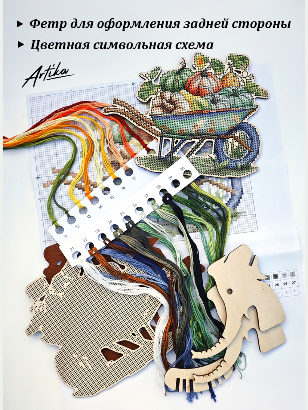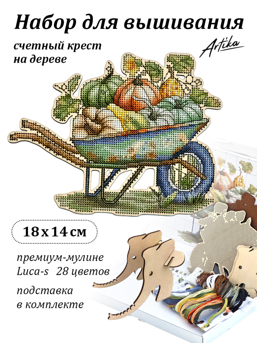 Набор для вышивания крестиком «Тележка» на деревянной основе от бренда «Артика». Размер готовой работы 18х14 см. Мулине Luca-S - 28 цветов. Также в комплекте: печатная цветная символьная схема и схема Saga, две иглы для вышивания, фетр для оформления задней стороны вышивки.